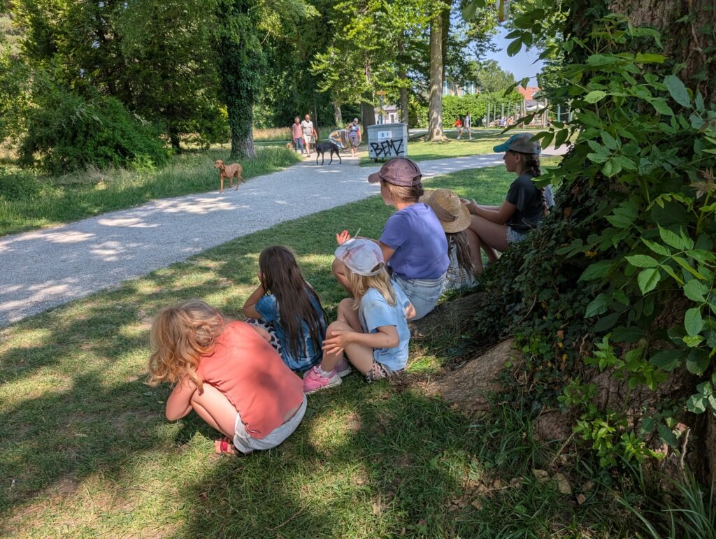 Mehrere Eltern warnten mich vor, dass ihre Kids nicht gerne Math machen. Das stresste mich nicht und ich betonte, dass das heutige Angebot freiwillig sei. Nach der Einführung und dem Vorstellen der Aufgaben, düsten alle Kids los. Es wurde gerechnet, gemessen, geschätzt, gestrichelt, usw. Mit slow motion wurden Runden gemessen, mit Kreide wurden Baumstämme gezählt, usw. Mir gefiel das Treiben am See!